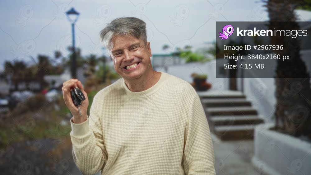Man holding car keys and smiling with hands raised on a street beside white building and palm tree; joy celebration.