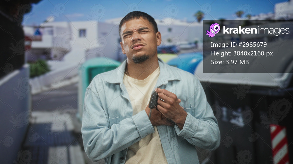 Man holding car keys to chest, wearing blue shirt, standing by recycling bins and dumpsters on a sunlit street; quiet contemplation.