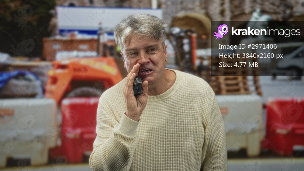 Man holding car keys to mouth with hand at nose, senior grey haired man in sweater speaking into keys beside orange barriers and wooden pallets on a street roadwork site; frustration urgency. - Kraken Images
