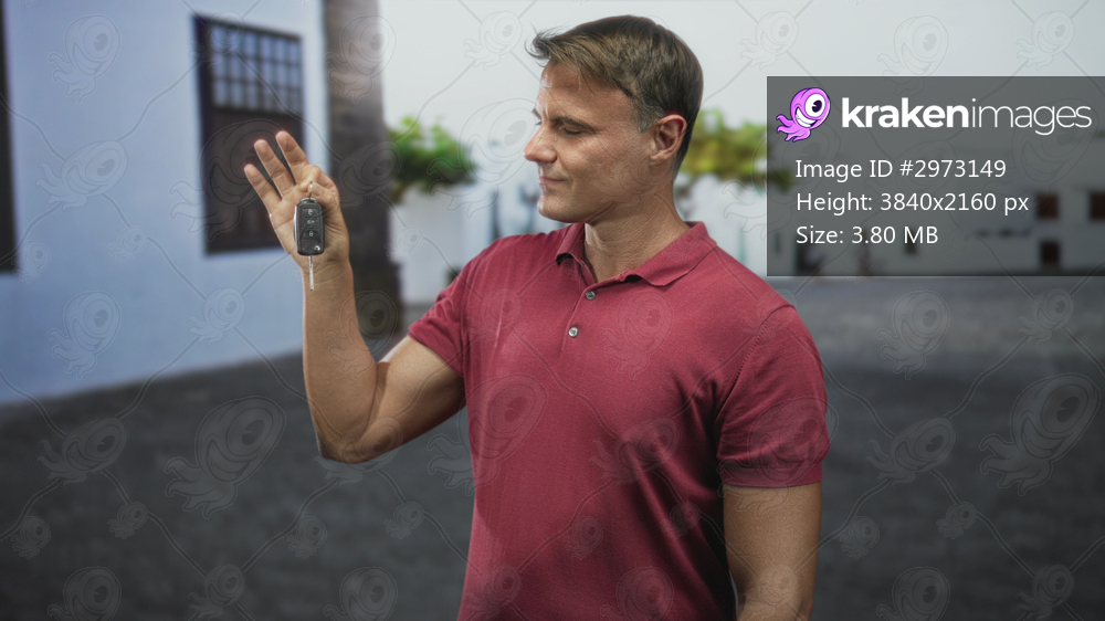Man holding car keys up with palm visible, inspecting the fob on a sunlit street plaza; ownership confidence.