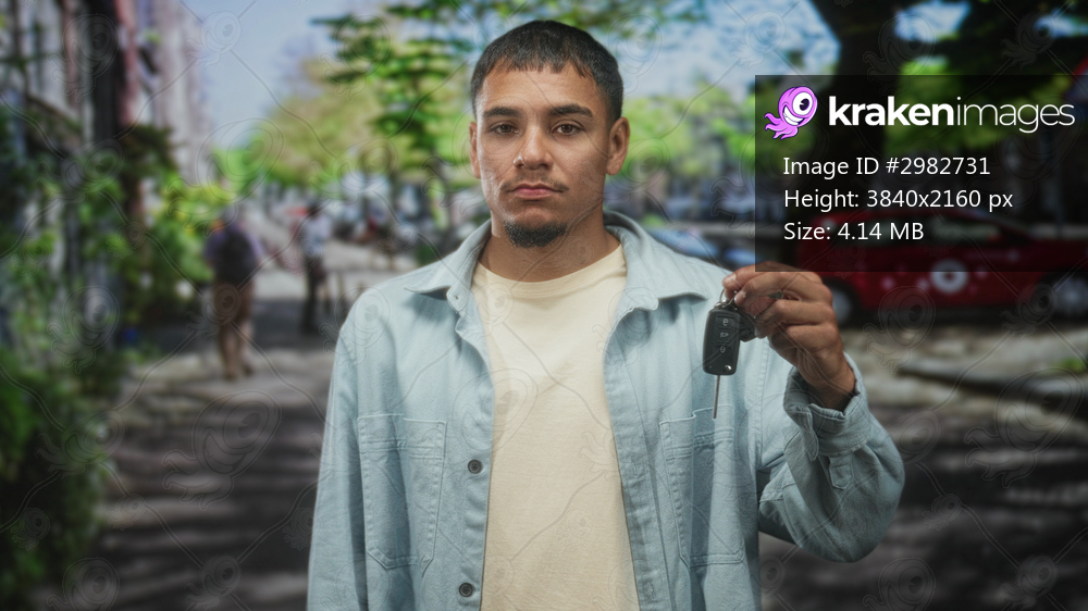 Man holding car keys while covering his mouth with one hand on a city street near a parked red car; regret mistake.