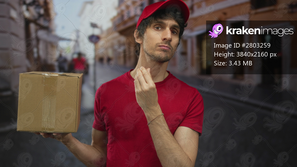 Man holding cardboard box with one hand while making pinched fingers gesture near chin on street; curiosity.