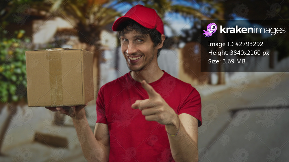 Man holding cardboard box pointing finger forward and smiling on street; reliable service confidence.
