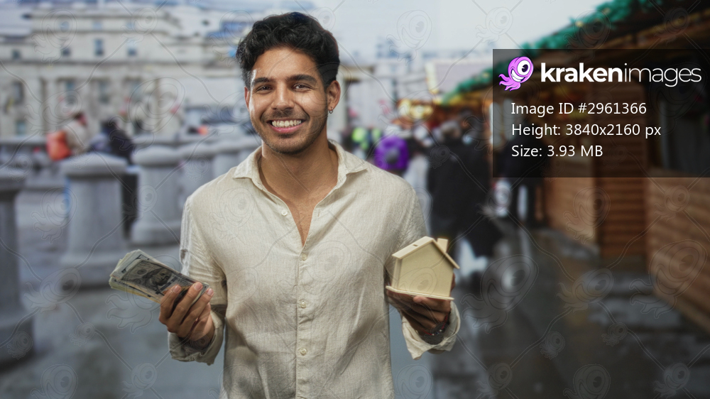 Man holding cash and a small wooden house, smiling and presenting both on a rainy city street market lined with wooden stalls; financial success confidence. - Kraken Images