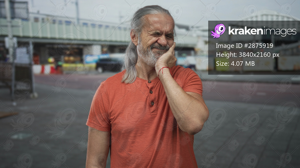 Man holding cheek with hand for toothache on street outside train station wearing orange shirt; discomfort concern.