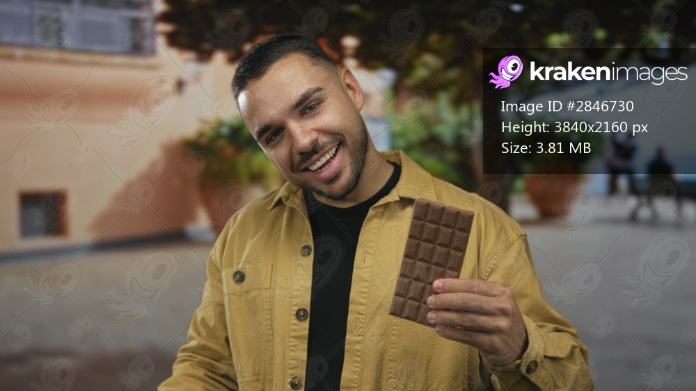 Man holding chocolate bar with both hands on city street smiling broadly; sweetness joy indulgence satisfaction.