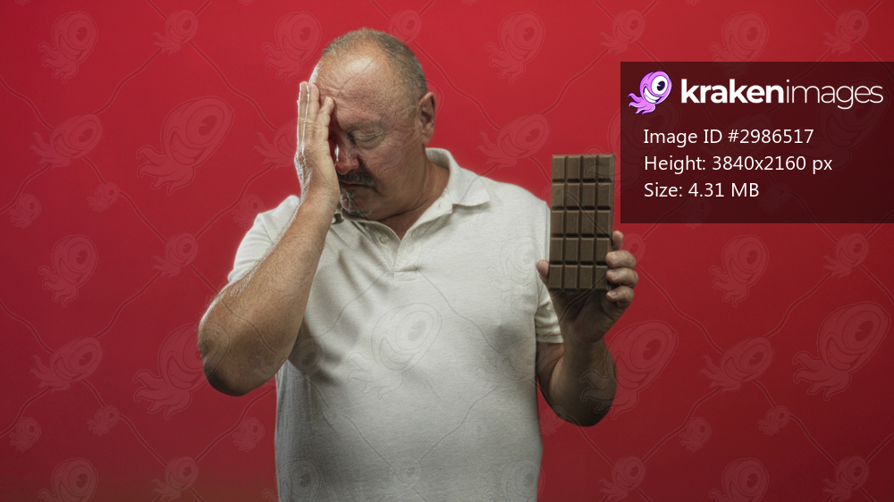 Man holding chocolate bar, palm to face indicating discomfort, wearing white polo, against red backdrop in studio; regret temptation.