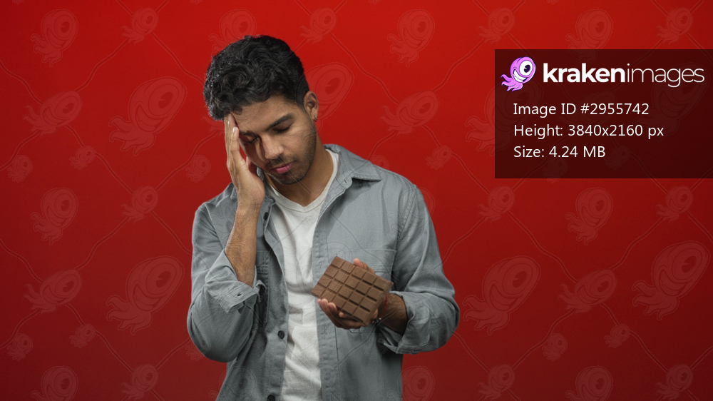 Man holding chocolate bar and pressing temple with hand against a red studio backdrop while examining the unwrapped chocolate; tired craving comfort.