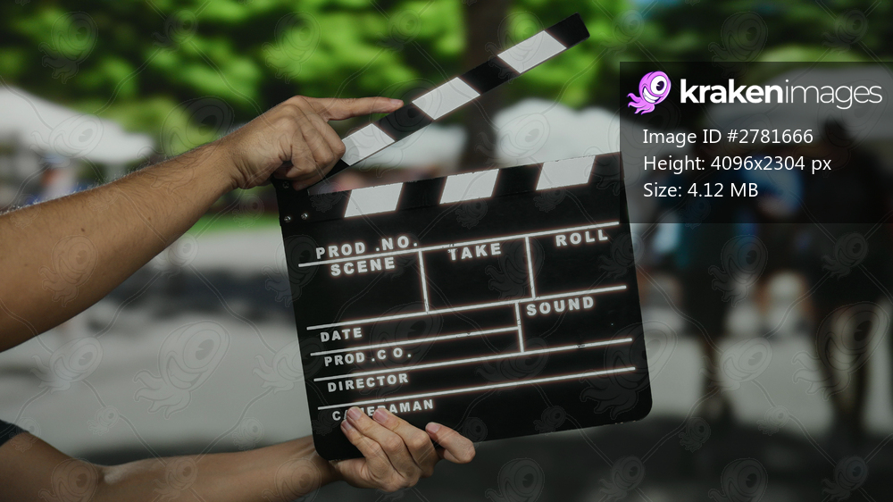 Man holding clapperboard in outdoor market with blurred people in background on a sunny day.