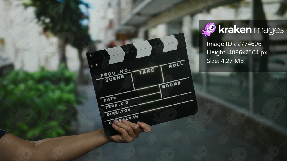 Man holding clapperboard on city street for film production, showcasing filmmaking process in urban setting, reflecting vibrant outdoor atmosphere.