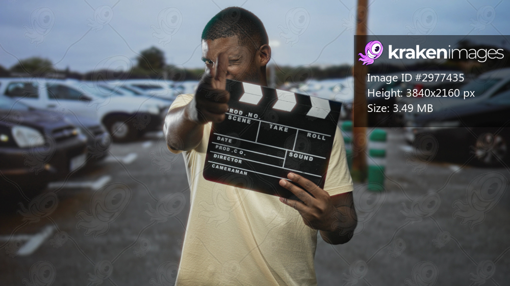 Man holding clapperboard points finger to camera beside parked cars on street during outdoor shoot; playful confidence.