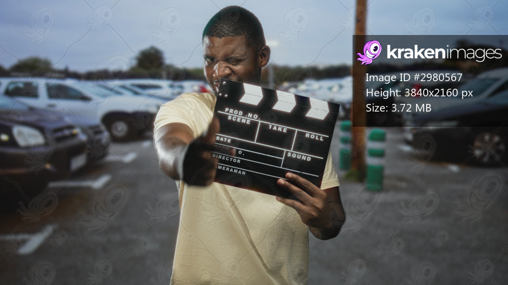 Man holding clapperboard points finger to camera beside parked cars on street during outdoor shoot; playful confidence.