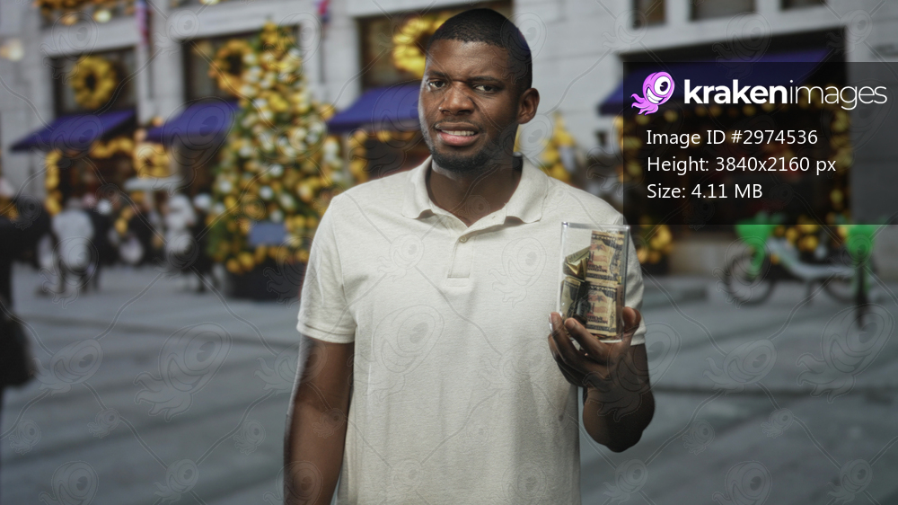 Man holding clear jar of dollars in his hand, holding it out on a decorated street with christmas tree and shop awnings; charity anxiety.