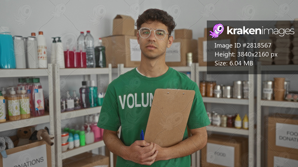 Man holding clipboard and checking organized donation boxes on shelves in building storage center; compassion volunteering.