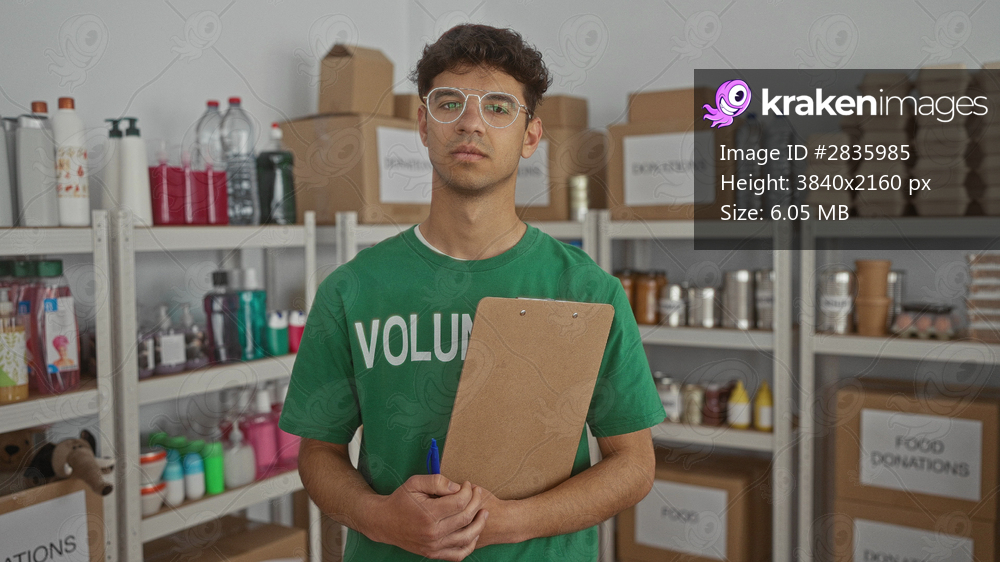 Man holding clipboard and checking organized donation boxes on shelves in building storage center; compassion volunteering.