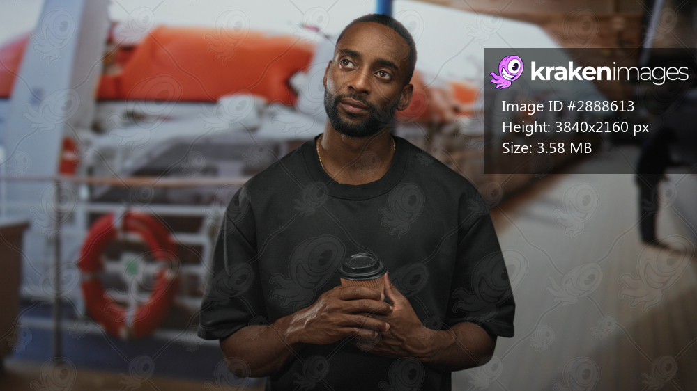 Man holding coffee cup with bare hands on street deck of cruise ship during morning break; quiet contemplation.