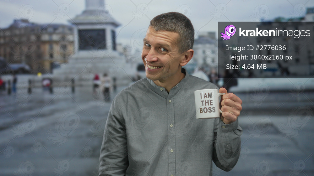 Man holding coffee cup with message in urban outdoor setting at trafalgar square smiling confidently in casual gray shirt displaying charm and confidence under cloudy sky. - Kraken Images