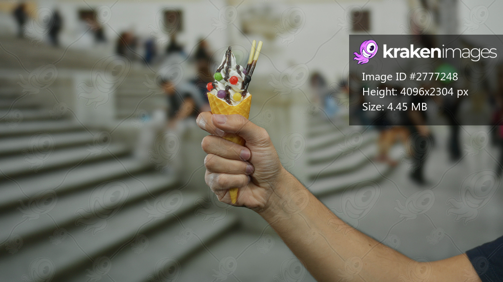 Man holding colorful ice cream cone in vibrant outdoor city setting with blurred steps and people in the background.