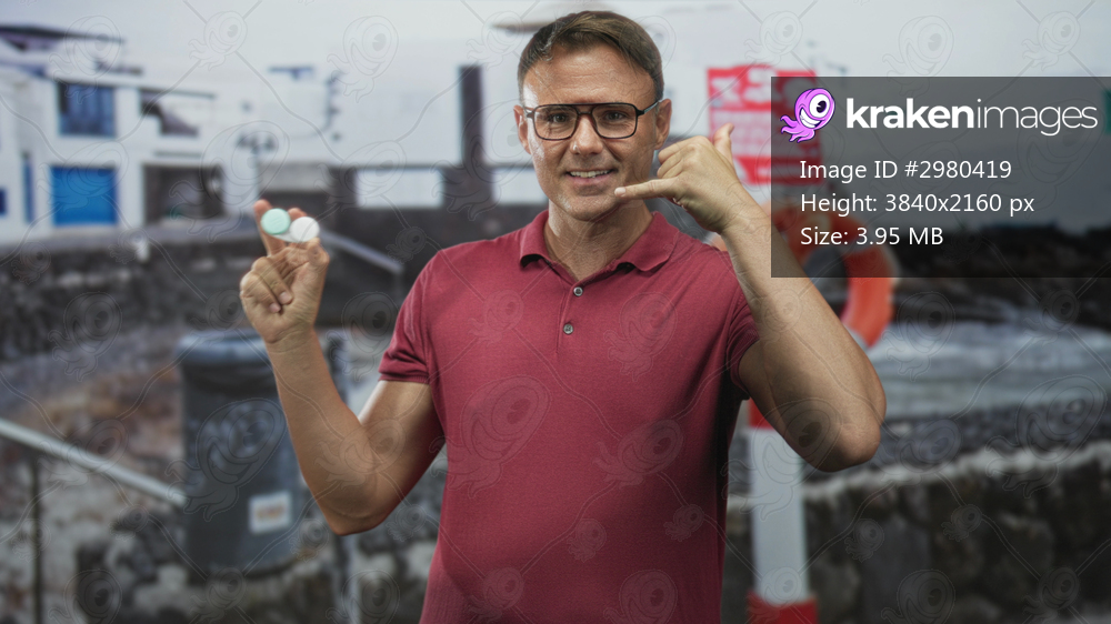 Man holding contact lens case and making phone gesture with thumb and pinky, front of coastal building and lifebuoy at a harbor; playful.