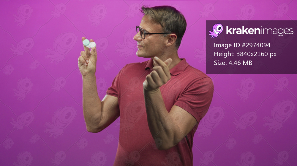 Man holding contact lens case and pinching index finger in purple studio backdrop while smiling and wearing glasses; personal care focus.