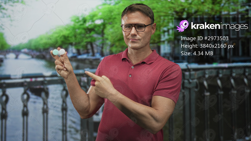 Man holding contact lens case and pointing finger on street bridge beside canal; confidence eye care hygiene.