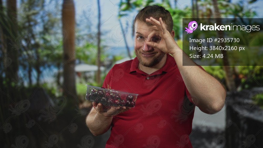 Man holding container of cherries making ok sign with hand near eye in studio; playful summer snack.