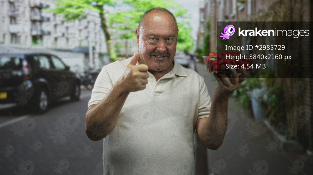 Man holding container of strawberries shows thumbs up on a narrow street with parked cars and brick walls; summer freshness satisfaction.