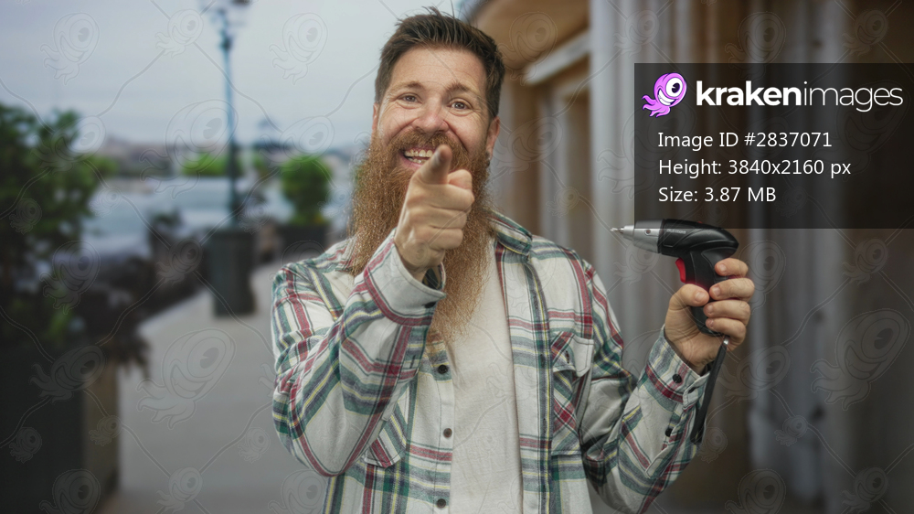 Man holding corded electric drill and pointing finger at it on street in front of building facade; confidence.