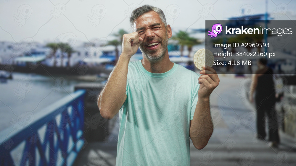 Man holding corn pastry and pressing finger to eye while sticking tongue out on street promenade; playful moment.
