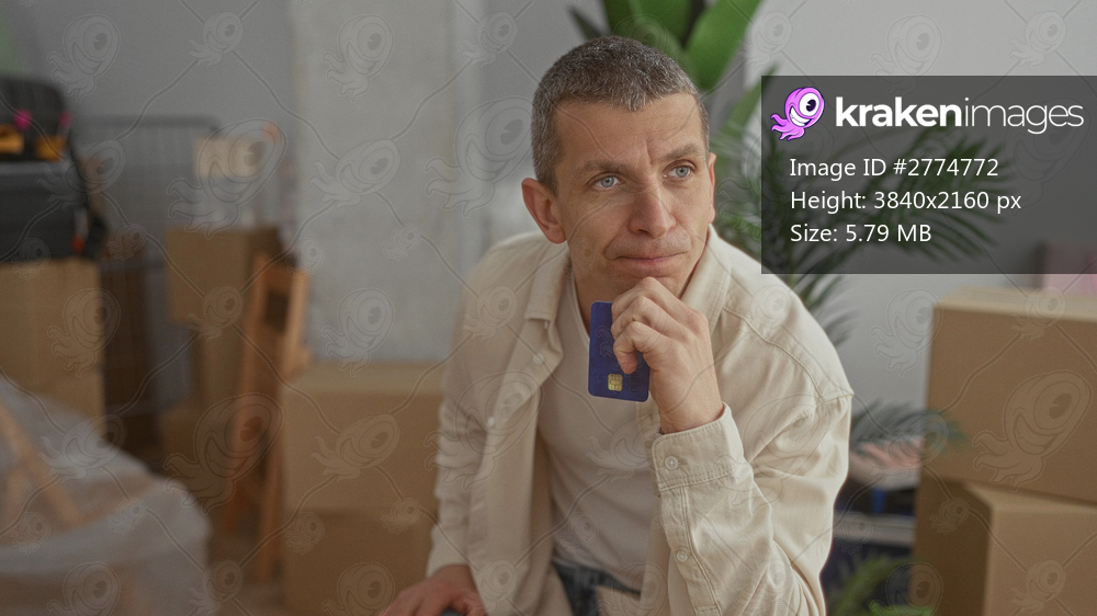 Man holding credit card thoughtfully in new apartment surrounded by moving boxes indicating financial planning for home purchase.