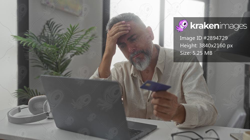 Man holding creditcard at building desk, hand on forehead for headache; online payment frustration debt.