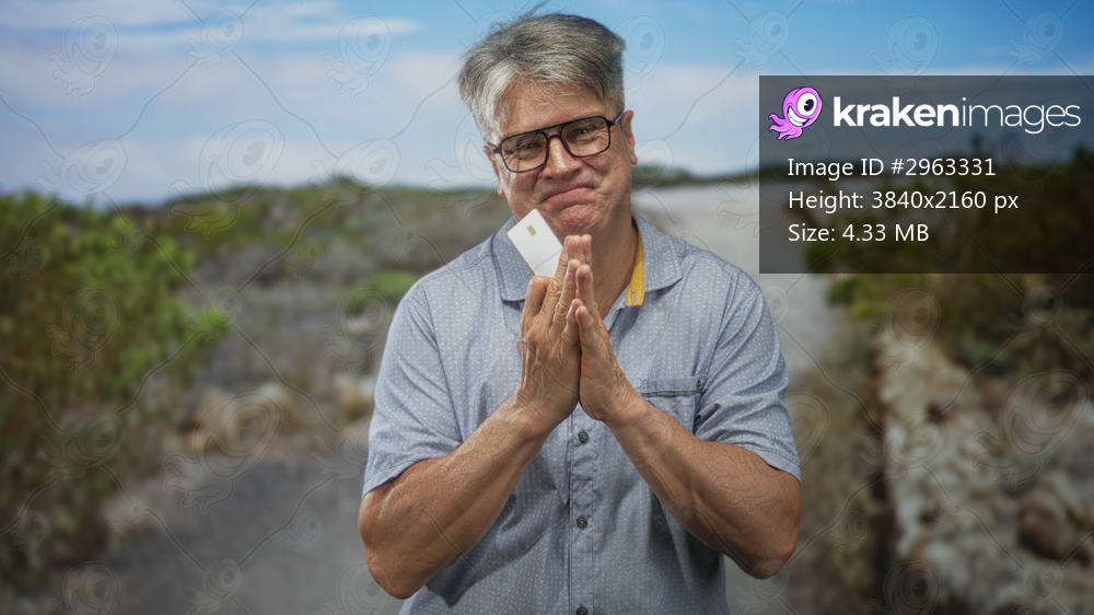 Man holding creditcard between clasped hands with a pleading smile on a street path lined with shrubs and rocks; hopeful gratitude.