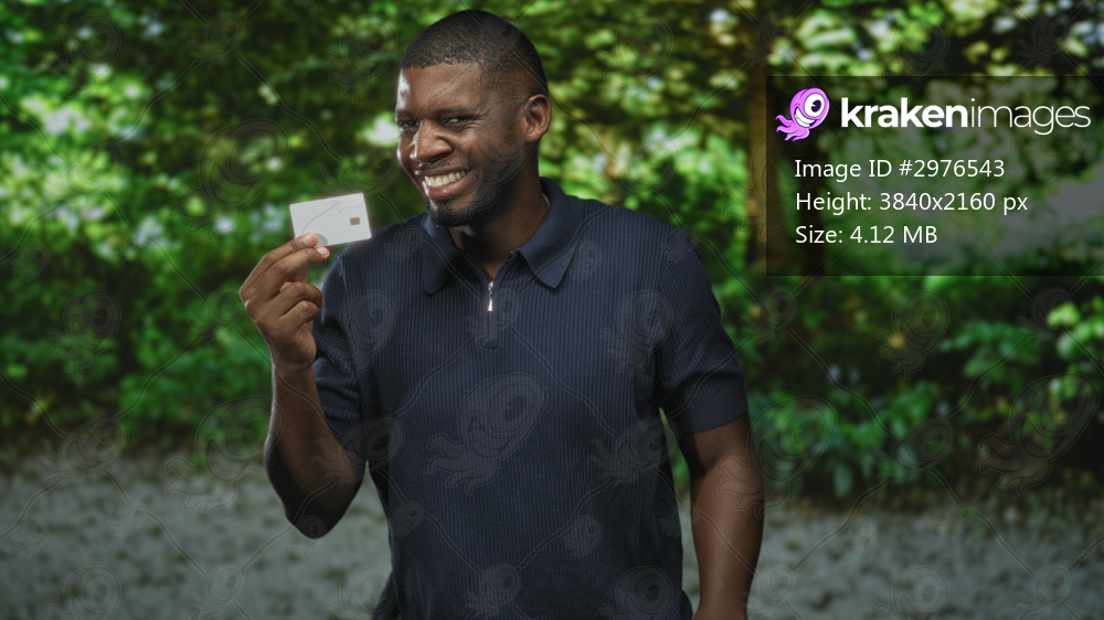 Man holding creditcard between fingers, smiling and presenting the chip card while wearing a navy polo shirt in a forest setting; confidence trust.