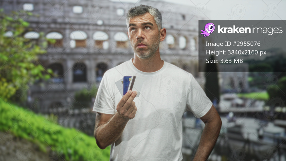 Man holding creditcard and debitcard in hand at historic building colosseum, facing camera with pensive look; financial anxiety.