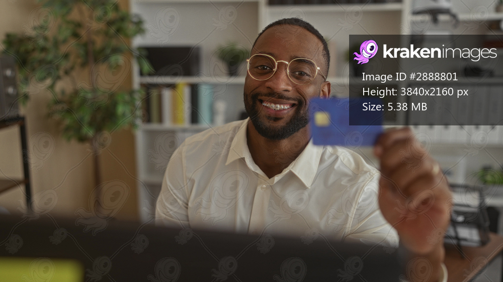 Man holding creditcard with hand at office desk near laptop monitor wearing glasses and braces; financial confidence.