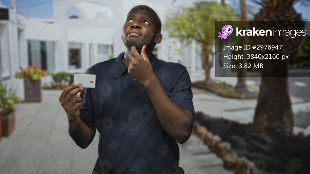 Man holding creditcard with hand to chin on street, inspecting chip and looking puzzled while considering payment options; financial uncertainty.