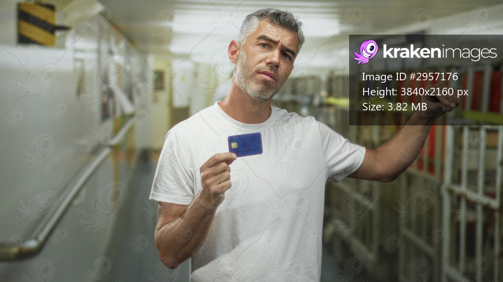 Man holding creditcard in a narrow building corridor, shows card up with hand while wearing white tshirt; financial worry.