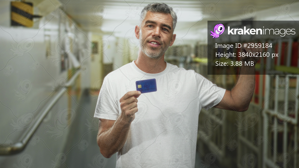Man holding creditcard in a narrow building corridor, shows card up with hand while wearing white tshirt; financial worry.