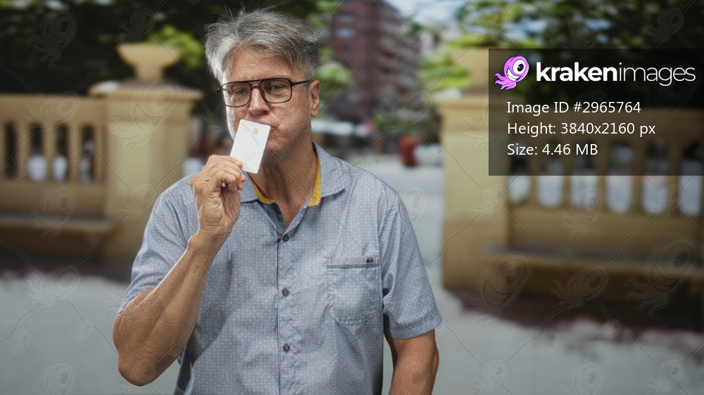 Man holding creditcard in hand, frowning at the card on a street with stone balustrade and benches; financial frustration.