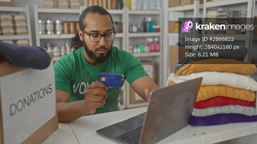 Man holding creditcard over laptop at donation building with folded sweaters and box, wearing green volunteer shirt and glasses; charity volunteering compassion. - Kraken Images