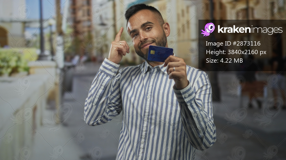 Man holding creditcard and pointing finger to head on a city street with striped shirt and beard; confidence thinking.