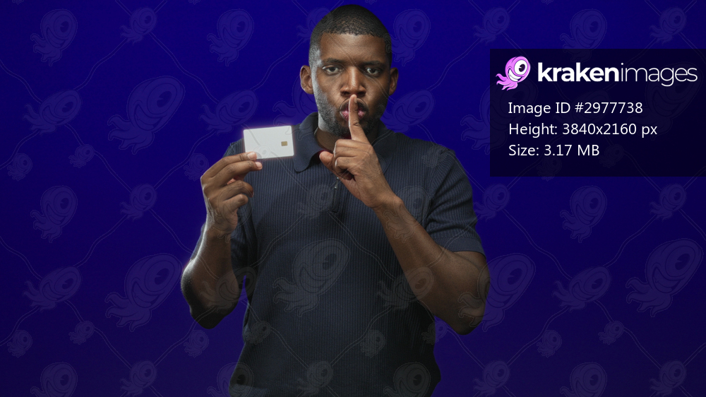 Man holding creditcard and pointing finger to lips in studio with navy polo visible, facing camera; privacy secretive trust quiet.