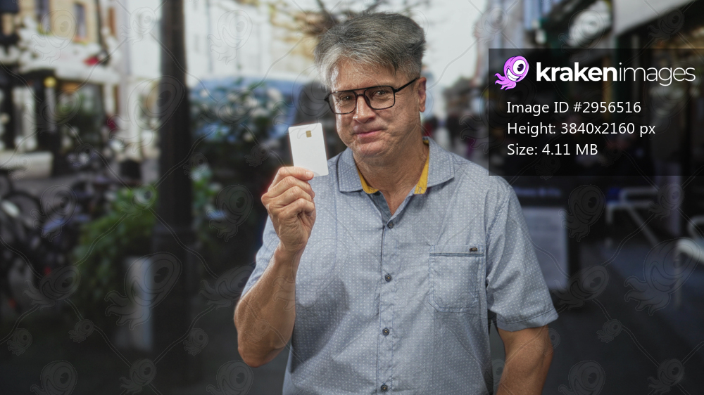 Man holding creditcard with right hand on busy street, raising card to camera while frowning; uncertainty trust.