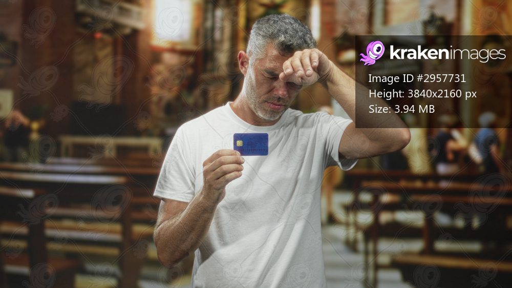 Man holding creditcard with right hand and showing it inside building church interior with pews; financial worry disclosure.