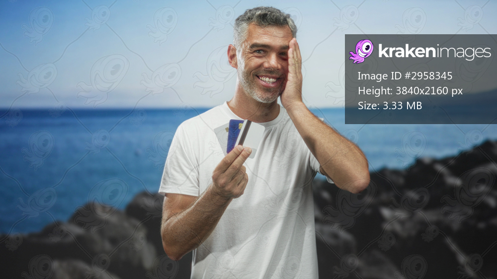 Man holding creditcard and smiling, covering right eye with hand gesture in studio; financial relief.