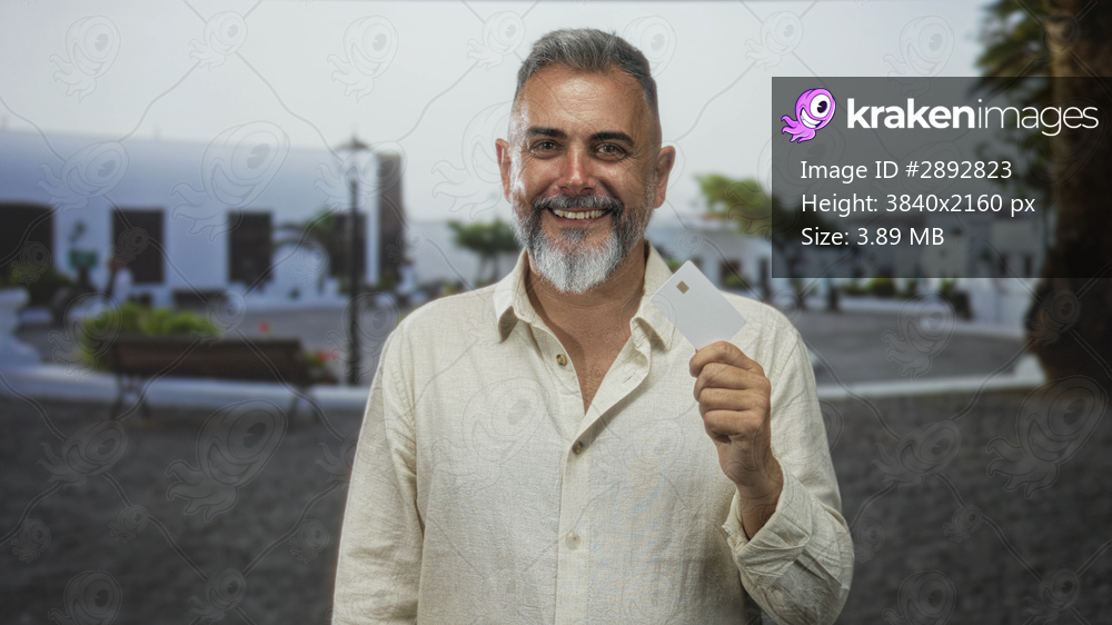 Man holding creditcard and smiling on street by white building and palm tree in sunny plaza; confidence finance.