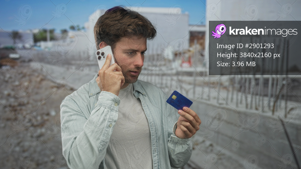 Man holding creditcard and talking on phone at building construction site outdoors under daylight; financial concern.