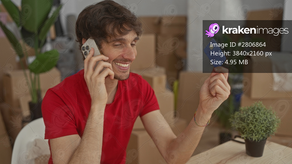 Man holding creditcard and talking on smartphone among moving boxes inside a building; future planning optimism.