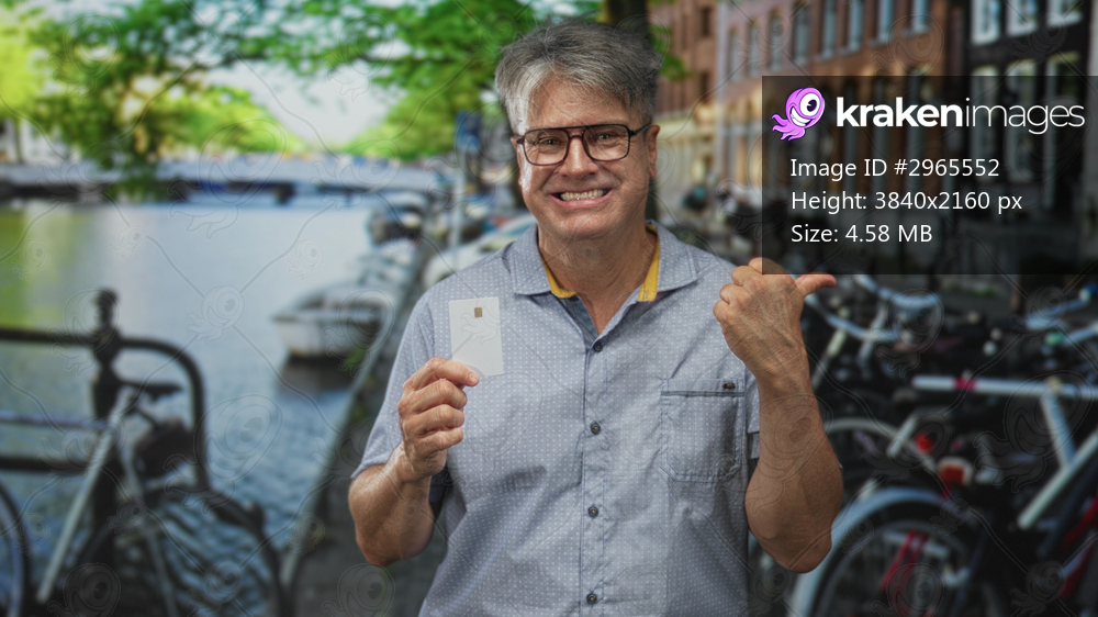 Man holding creditcard with thumb pointing and smiling on street by canal; confidence secure payment.