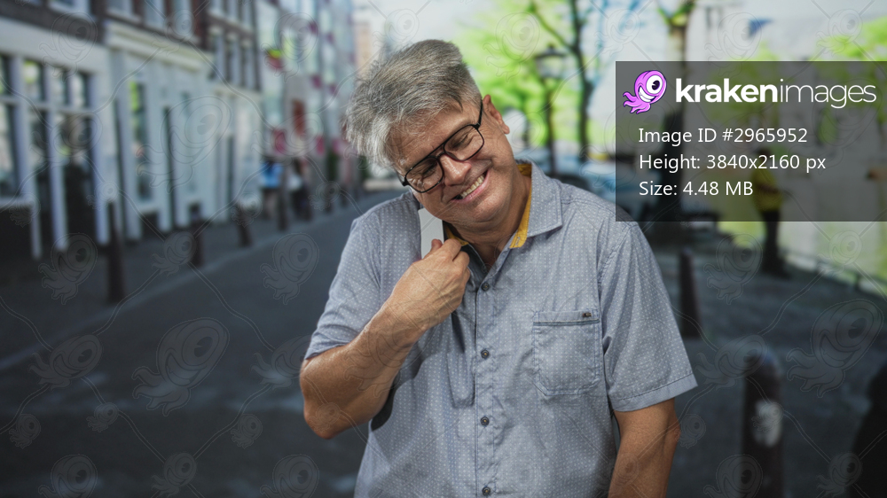 Man holding creditcard to chest, rubs shoulder while wincing and checking card on a busy street; elderly finance concern.